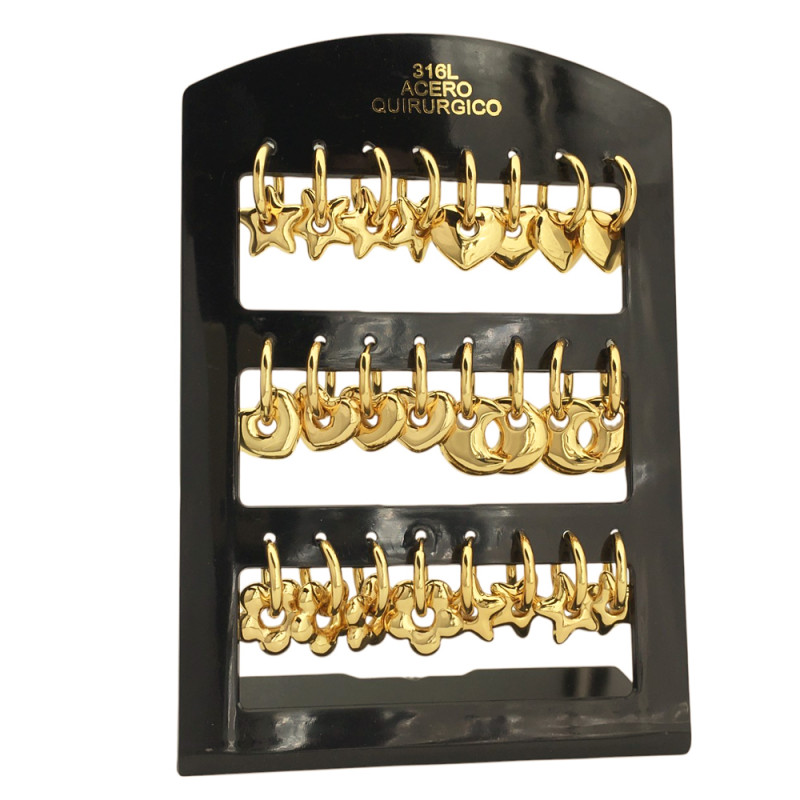 • DORADO BLISTER X12 PARES BISAGRA C/ 6 MOTIVOS INFLADOS LUNA - 2 MOTIVOS CORAZO - 2 MOTIVOS ESTRELLA - FLOR ARO